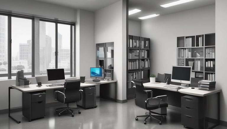A modern workspace with a focus on technology. In the foreground, there is a black laptop with a distinctive logo placed on a table beside a smartphone propped on a stand. A man is sitting in the background, also using a similar laptop. The setting is minimalistic with a combination of white furniture and a textured brick wall.